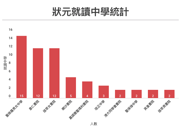 其中圣保羅男女中學狀元數(shù)目最多,有15名;其次為皇仁書院及拔萃女書院,同樣有12名。雖然第三位的喇沙書院只佔5名狀元,但在2018年該校出現(xiàn)歷屆DSE首名、亦是截至目前唯一一名「終極狀元」!