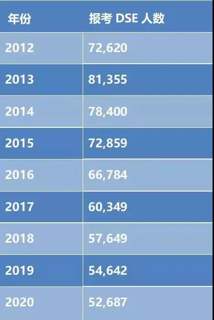 大家可以看到DSE考試人數(shù)的逐年減少,2020年甚至只有52687人。與之相對(duì)的是▼