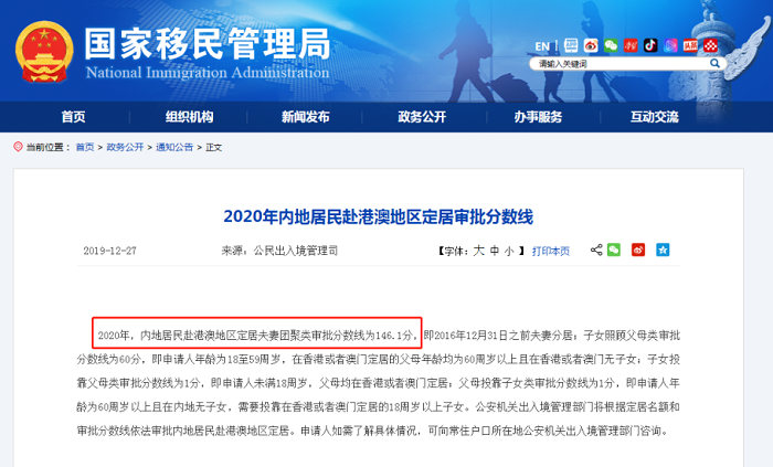 國(guó)家移民管理局在2020年公布的內(nèi)地居民赴港澳地區(qū)定居審批分?jǐn)?shù)線提及,