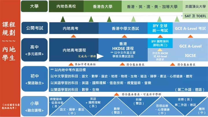 小學、初中課程實施雙軌制,國家義務教育課程及香港課程雙軌并行。高中課程實施多軌制,將同時提供內地高考課程、香港中學文憑試(HKDSE)課程及IGCSE、GCE IAL、NCUK IFY、SAT及TOEFL等國際課程。