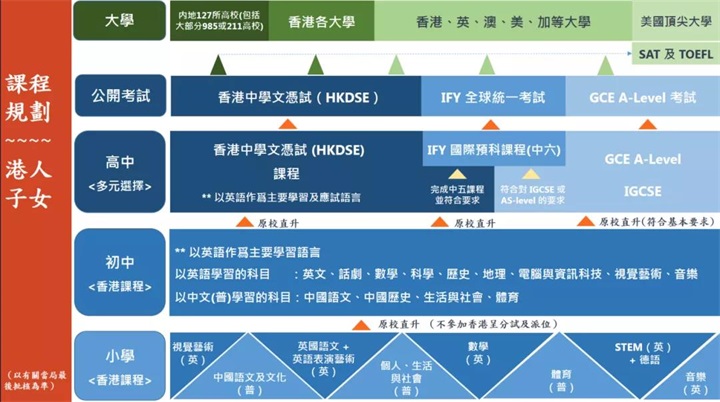 總之,兩種課程各有優劣勢,對于想要走中高考路線,沒有香港身份的家庭,選擇內地課程更合適,如果有香港身份,或者打算出國留學的家庭可以優先選擇香港課程,另外因為選擇了內地課程后無法再轉香港課程班,所以建議有香港身份的家庭選擇時要慎重!