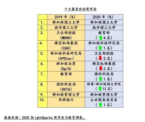 耶魯-新加坡國大學(xué)院獎學(xué)金晉升了12位排名第8教育部獎學(xué)金晉升4位,排名第3~衛(wèi)生部控股和樟宜機場集團獎學(xué)金同時下滑了2位~在2019年調(diào)查中有12%和7%受訪者認為本地獎學(xué)金和海外獎學(xué)金都不該附帶其他須履行的特定服務(wù)條件2020年這個數(shù)據(jù)已經(jīng)下降到8%和4%~