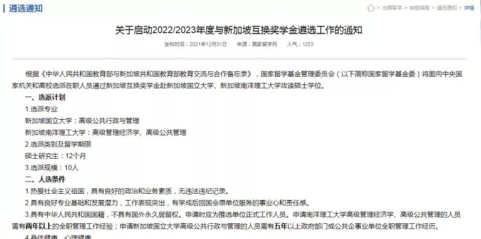 2022/2023年度中國(guó)去往新加坡公派留學(xué)生項(xiàng)目開(kāi)通,符合條件的在職人員可以通過(guò)新加坡互換獎(jiǎng)學(xué)金赴新加坡國(guó)立大學(xué)、新加坡南洋理工大學(xué)攻讀碩士學(xué)位。
