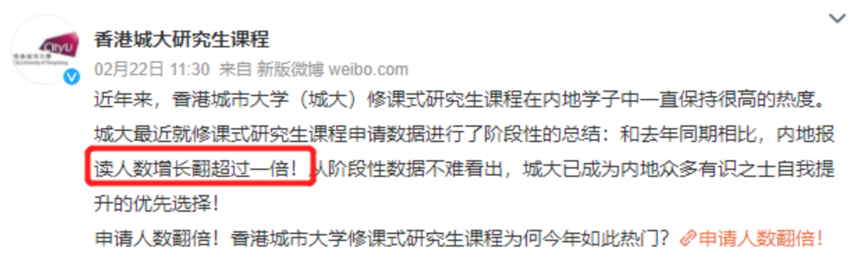上面的77%已經(jīng)足以反映出今年申請(qǐng)的競(jìng)爭(zhēng)激烈性“強(qiáng)得很”,但沒想到還有更恐怖的數(shù)據(jù),香港城市大學(xué)公布的一組官方數(shù)據(jù)顯示,城大申請(qǐng)量增長(zhǎng)了100%!