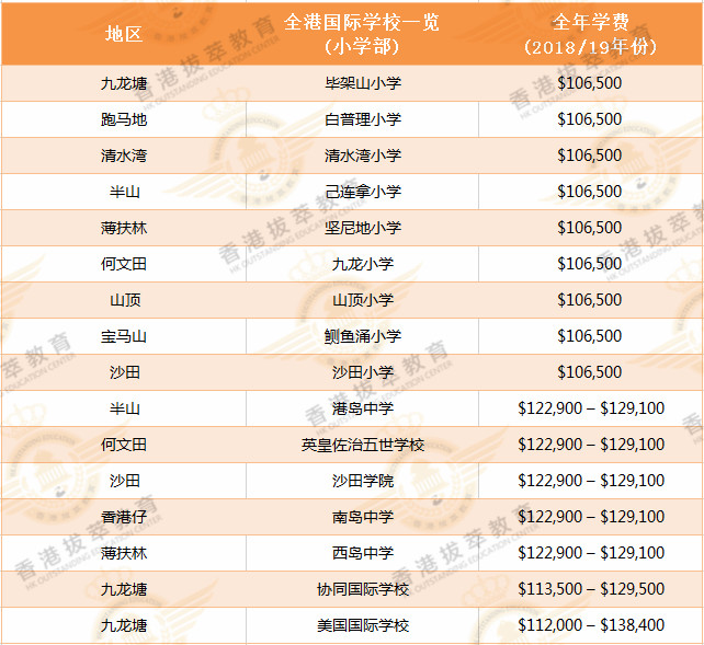 遐邇聞名的漢基國際學校,由Year 1至Year 13的學費,每年約需港幣$160,000–$250,000。學生一旦獲取錄,需要馬上立即支付留位費港幣100,000元,此費用將于扣減建校費及第一學期學費。而且還未計算建設費、債券、資本證書等費用。