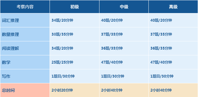ISEE初、中、高級三個級別(申請5-12年級)考察內容時間分配: