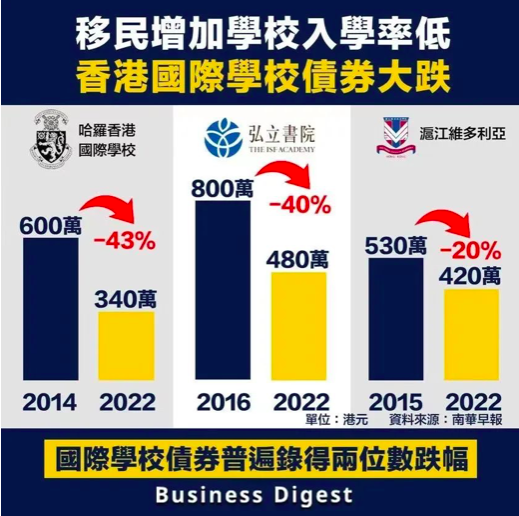 然而,近兩年因受到疫情和移民潮的影響,香港國(guó)際學(xué)校的入學(xué)率逐年走低,進(jìn)而導(dǎo)致債券價(jià)格隨之出現(xiàn)大幅跌落。