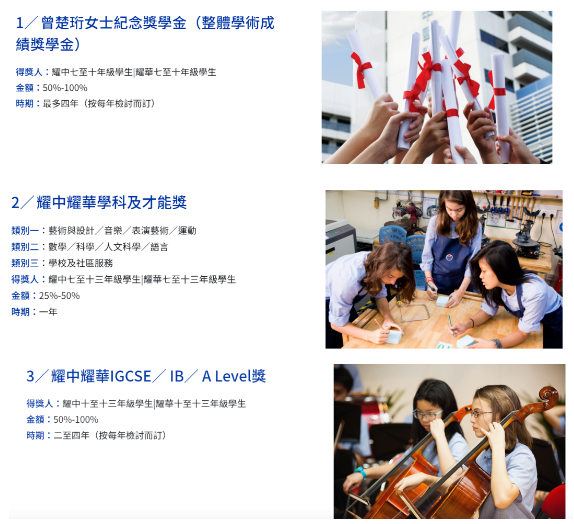耀中的獎學金有3類,曾楚珩女士紀念獎,耀中耀華學科及才能獎,以及耀中耀華IGCSE/IB/A Level獎。最高學費可以減免100%。