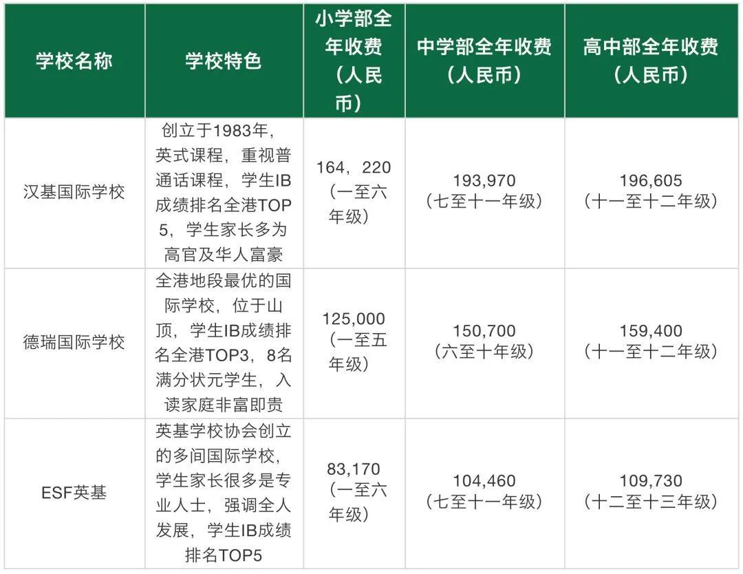 下圖是三所香港頂尖國際學校的收費情況,其中最高的一年學費近20萬。