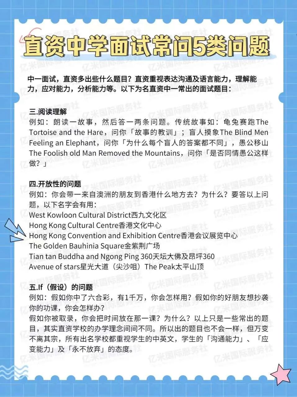 香港直資中學辦學理念各不相同,題目出的也是眼花繚亂,但所有熱門直資都重視申請人這幾點:中英文溝通能力,學生的應變能力和抗挫能力。主要有以下5大常見題型: