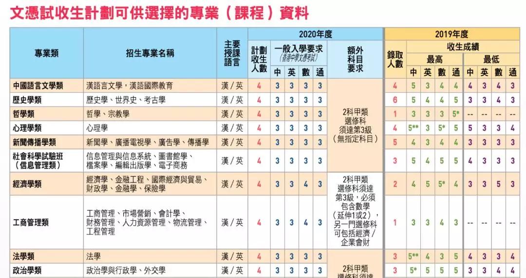 一般最低錄取要求是“3、3、2、2”,即中國語文科(3)、英國語文科(3)、數學科(2)、通識教育科(2)。藝術和體育類專業的學生要求還會再低一些。