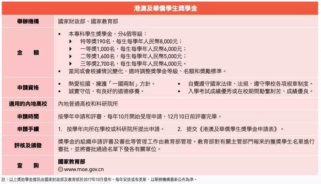 除了助學金,還有各式各樣的獎學金可以申請。比如國家教育部設立了“港澳及華僑學生獎學金”,每學年給將近5500名優秀學生提供四個不同檔位獎勵。