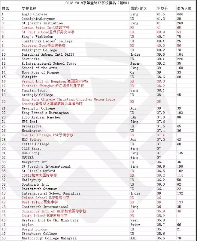 早前,IB-Schools.com將各個(gè)學(xué)校已公布的2018-2019年的考試成績(jī)按學(xué)生平均成績(jī)進(jìn)行排序,評(píng)選出全球IB學(xué)校50強(qiáng),其中香港學(xué)校就獨(dú)占12個(gè)席位!