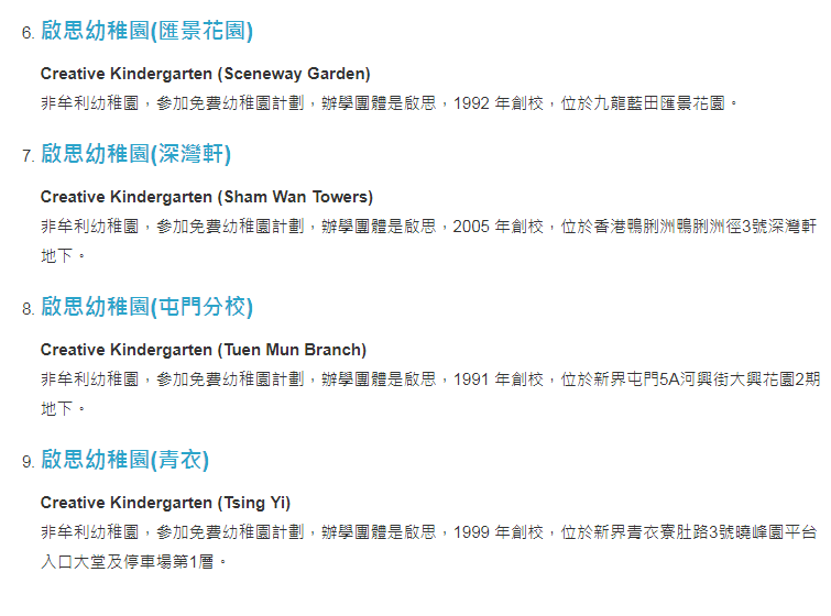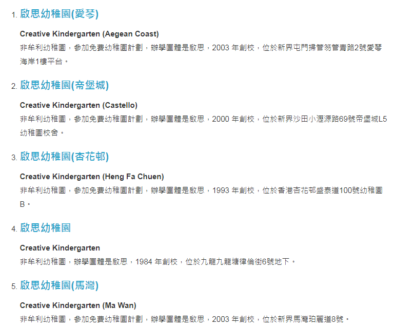 注意:其余的啟思幼稚園幼兒園是有參加「免費優質幼稚園教育計劃」,當中有: