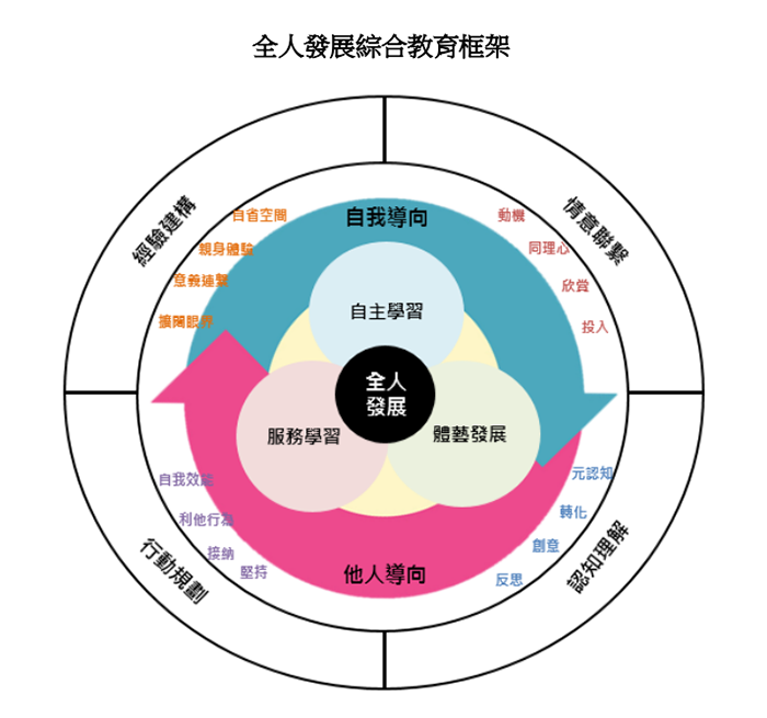 什么叫全人教育?自主學習、服務學習、體藝發展三大方面。讓孩子變成不僅從課堂中學習;從實踐活動中讓學生在親身經歷及反思后,有機會把感受付諸行動,并透過展示自己的經驗和想法,沉淀對事情的認知和內化相關的價值觀;體育藝術多方面發展。