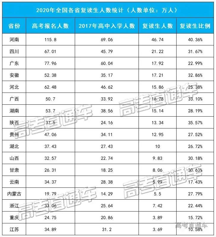 近日,各省份陸續(xù)公布了2020年高考復讀生的人數(shù):