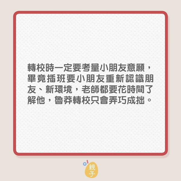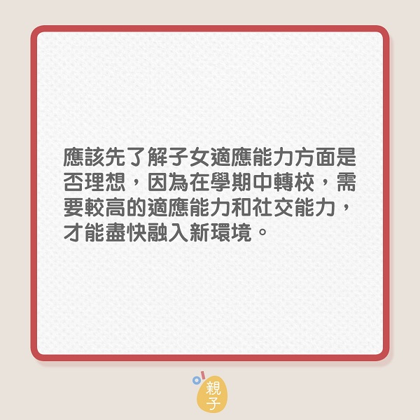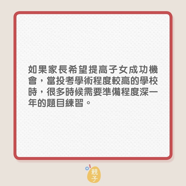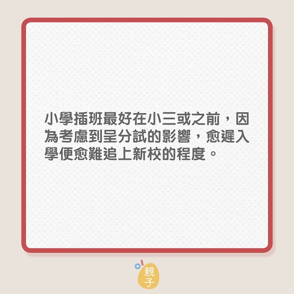筆試方面,當(dāng)時(shí)自己小朋友是插班讀四年級(jí),校方則會(huì)安排小朋友做當(dāng)年三年級(jí)下學(xué)期的卷去評(píng)定小朋友學(xué)術(shù)能力,因此如果家長(zhǎng)有意插班,可向就讀該校的家長(zhǎng)了解一下試卷程度。最后Ken Sir建議,轉(zhuǎn)校時(shí)一定要考量小朋友意愿,畢竟插班要小朋友重新認(rèn)識(shí)朋友、新環(huán)境,老師都要花時(shí)間了解他,魯莽轉(zhuǎn)校只會(huì)弄巧成拙,一般而言,小學(xué)插班最好在小三或之前,因?yàn)榭紤]到呈分試的影響,愈遲入學(xué)便愈難追上新校的程度。