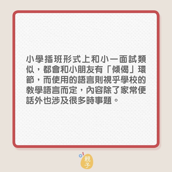 兒童發(fā)展及升學(xué)專家Ken Sir以自身小學(xué)插班經(jīng)驗(yàn)分享,形式上和小一面試類似,都會(huì)和小朋友有「傾偈」環(huán)節(jié),而使用的語(yǔ)言則視乎學(xué)校的教學(xué)語(yǔ)言而定,內(nèi)容除了家常便話外也涉及很多時(shí)事題。