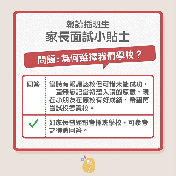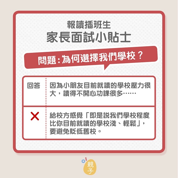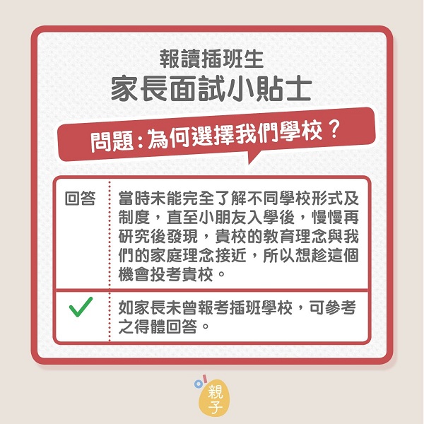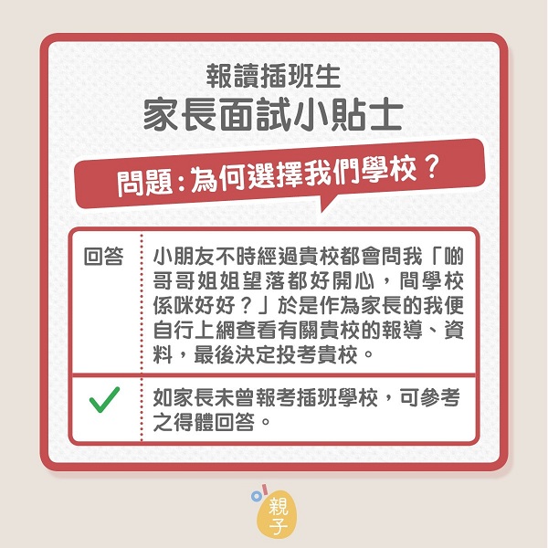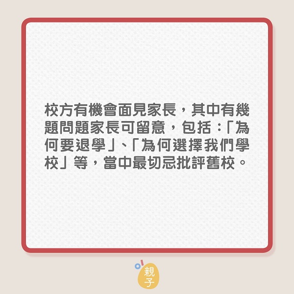 除了面見小朋友外,校方亦會(huì)面見家長(zhǎng),Ken Sir當(dāng)時(shí)也和校方進(jìn)行了約30分鐘的面見,其中有幾題問題家長(zhǎng)可留意,包括:「為何要退學(xué)」、「為何選擇我們學(xué)校」等,當(dāng)中最切忌批評(píng)舊校,或指出舊學(xué)校壓力太大,這些都是必定不合格的回應(yīng)。