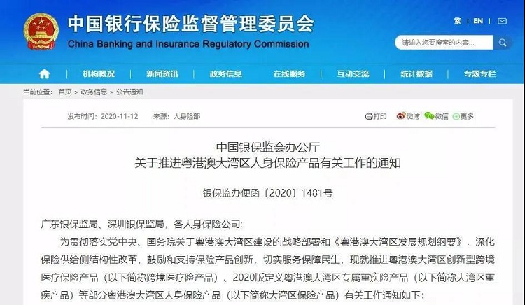 11月12日,銀保監(jiān)會(huì)發(fā)布了《關(guān)于推進(jìn)粵港澳大灣區(qū)人身保險(xiǎn)產(chǎn)品有關(guān)工作的通知》(以下簡(jiǎn)稱《通知》),