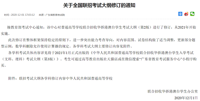 接教育部考試中心通知,該中心對普通高等學校聯合招收華僑港澳臺學生考試大綱(第2版)進行了修訂,從2021年開始實施。