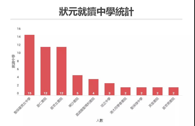 據(jù)統(tǒng)計2012年至2020年80名DSE狀元資料,當(dāng)中大部分人均來自傳統(tǒng)名校。其中,圣保羅男女中學(xué)狀元數(shù)目最多,占15名;其次為皇仁書院及拔萃女書院,同樣占12名。雖然第三位的喇沙書院只占5名狀元,但在2018年該校出現(xiàn)歷屆DSE首名、亦是截至目前唯一一名「終極狀元」,其畢業(yè)生黃子衡在當(dāng)年取得8科5**!