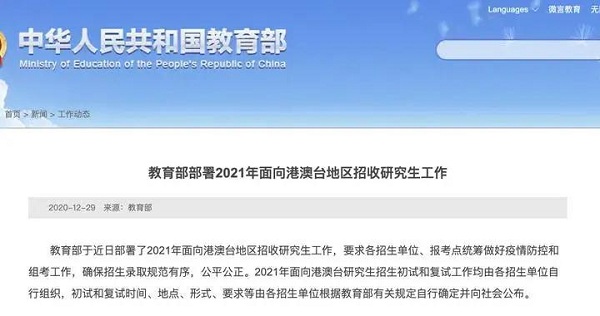 2021年面向港澳臺地區招收研究生工作,網上報名時間為2021年1月1日至15日。