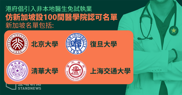 港府倡議成立委員會,訂立一份約有100間非本地醫學院的名單,符合條件的醫生可免除執業試要求。同時,認可醫學院的質素要與港大及中大醫學院相約。