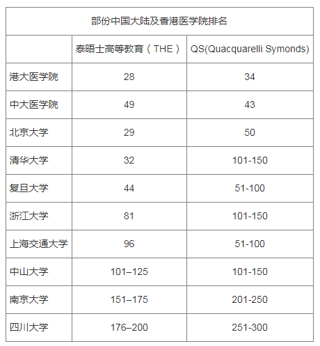 以及QS(Quacquarelli Symonds)去年世界大學醫學院排名,100名以內共有5間中國大學的醫學院。