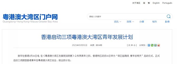 港府于2月26日正式啟動三項鼓勵港青在粵港澳大灣區創業、就業的計劃,分別是: