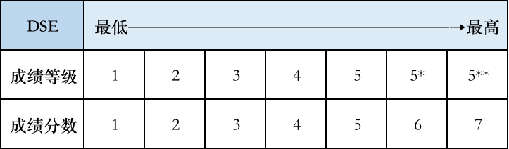 DSE計分以等級的方式呈現,劃分為七個等級,總分按照各科分數相加計算。