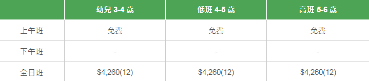 學校有參加「幼稚園教育計劃」,以下列出扣減政府資助后不同班別的全年學費和期數。