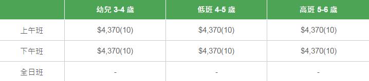 學校有參加「幼稚園教育計劃」,以下列出扣減政府資助后不同班別的全年學費和期數。