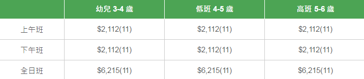 學校有參加「幼稚園教育計劃」,以下列出扣減政府資助后不同班別的全年學費和期數。